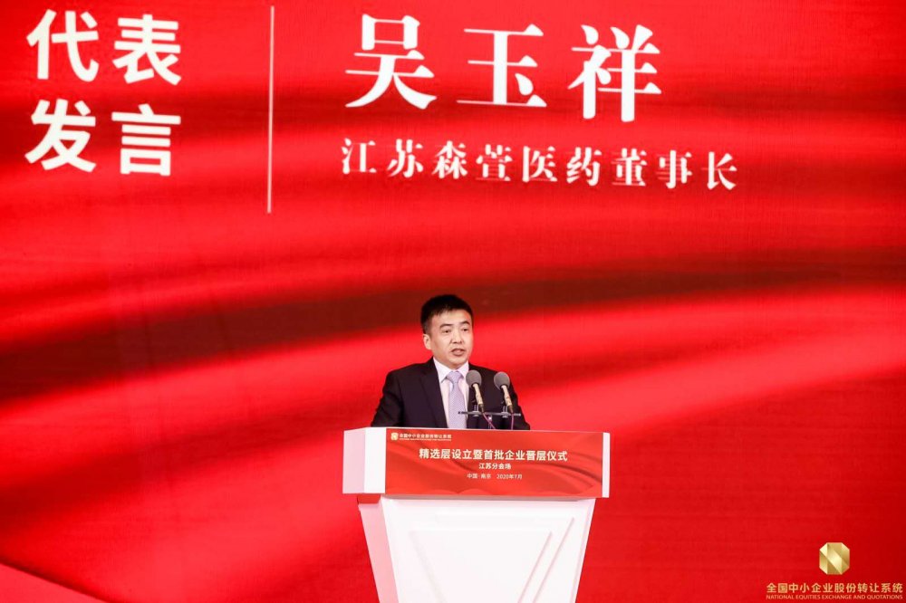 公司董事长吴玉祥做为江苏5家首批企业代表发言,吴玉祥寄语新三板精选层首批晋层企业,江苏森萱医药股份有限公司见证了国家深化资本市场改革的决心和创新;见证了全国股转公司及各级监管部门在辅导备案、材料审核、股票发行等各阶段的“精选层”效率;见证了广大投资者价值判断的理性及踊跃参与的热情。我们深感使命光荣、责任重大!祝愿精选层行稳致远,新三板繁荣昌盛!